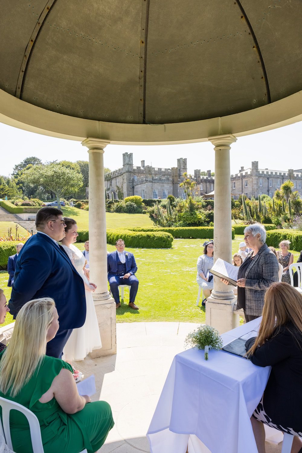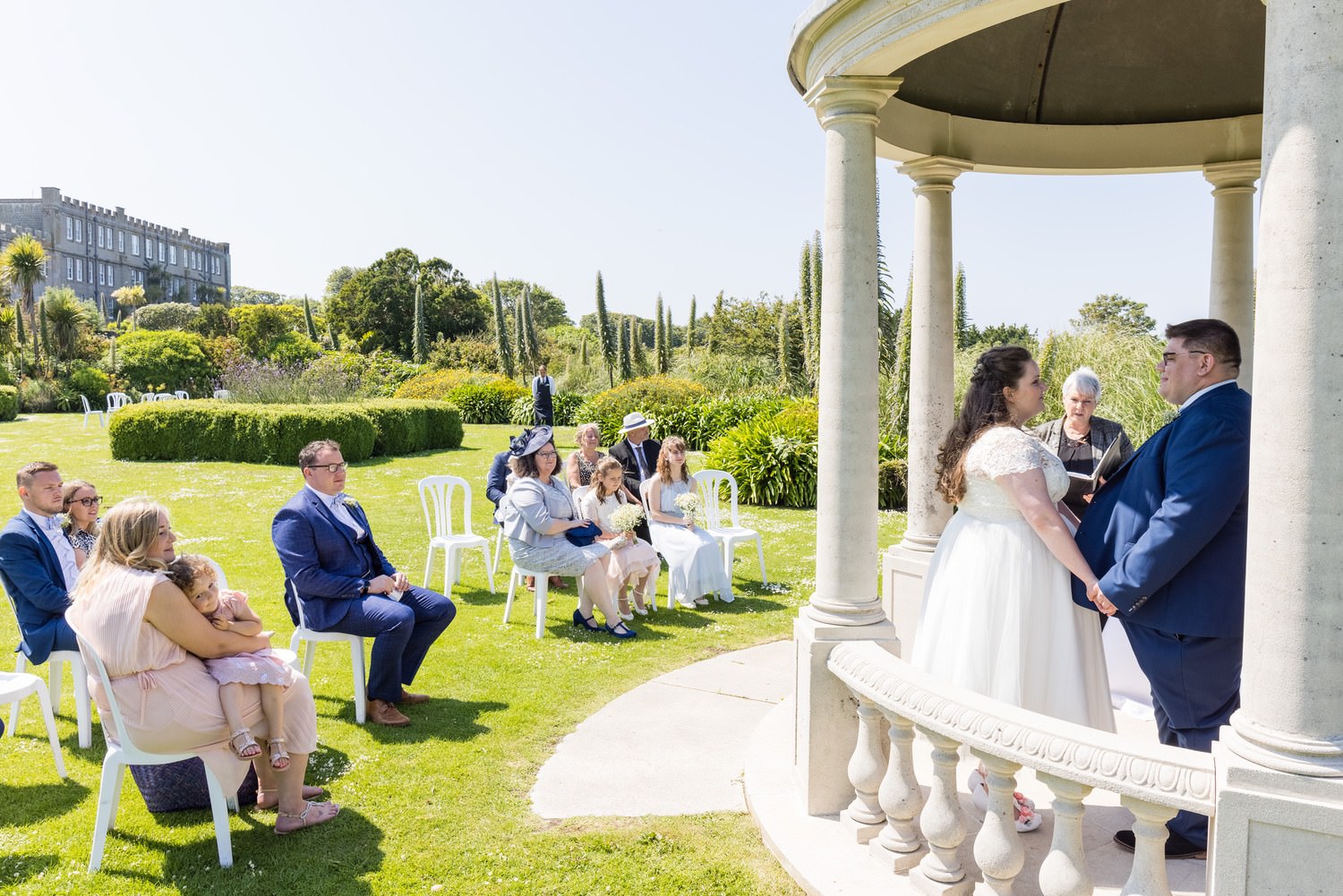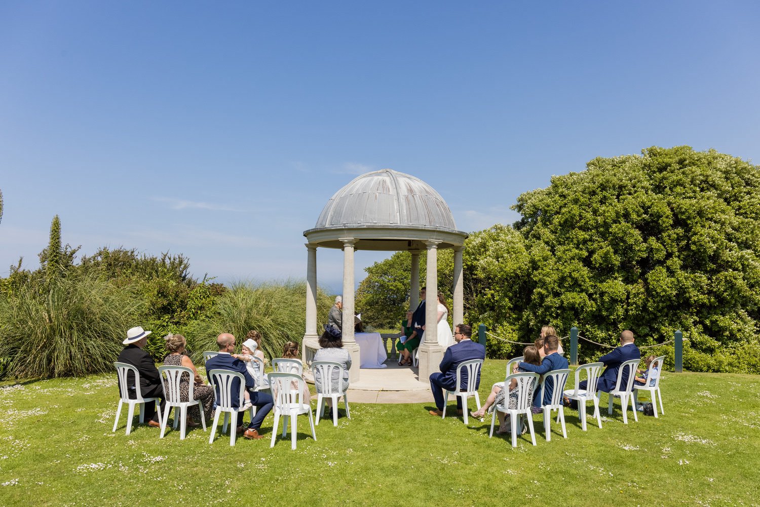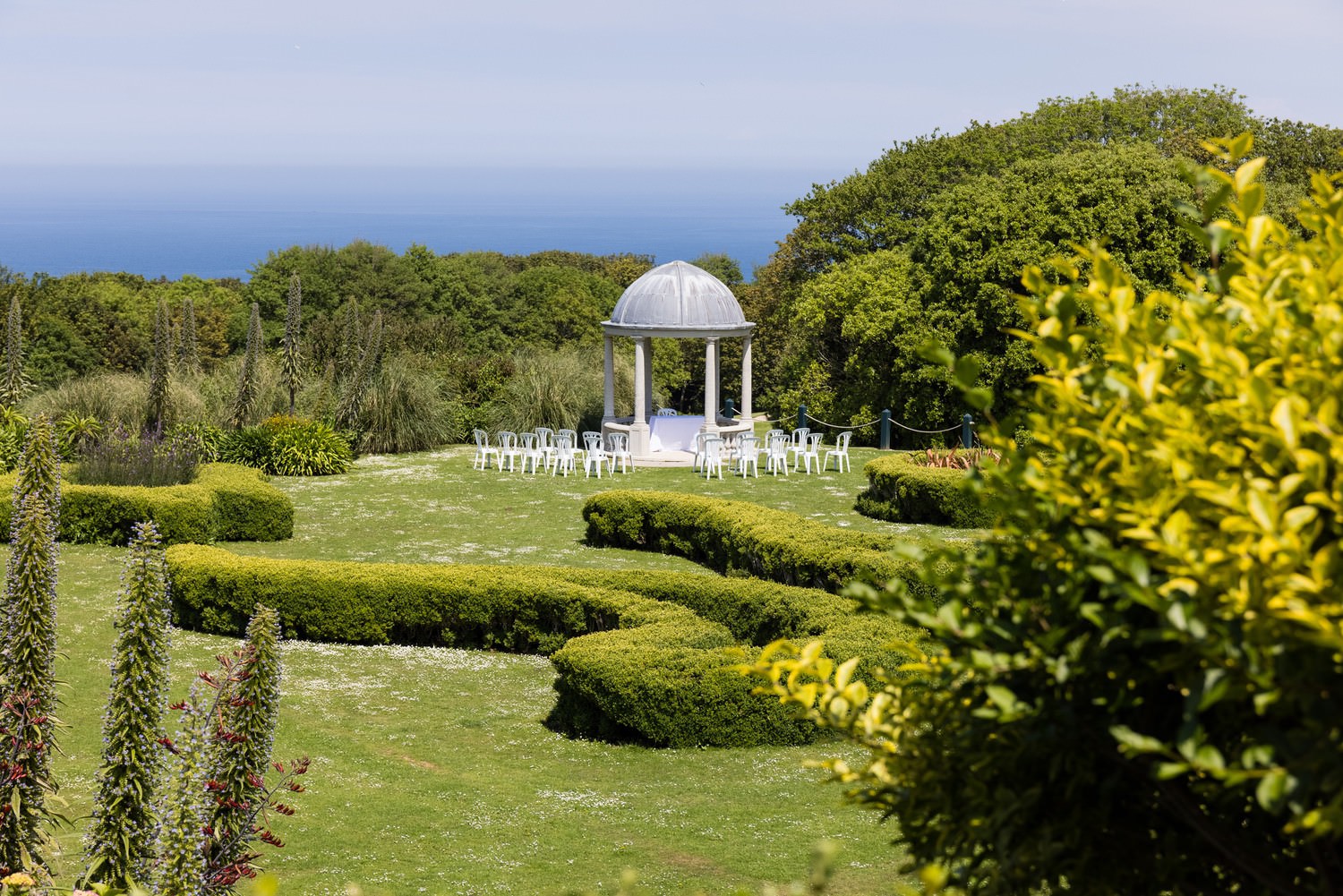 Moving outdoors, you'll love the Sea View Pavilion, which can host up to 120 guests for your ceremony. It has panoramic views of St. Ives Bay, and you'll enjoy the gardens all around too. This is where Mr and Mrs Carpenter had their ceremony, and it is just gorgeous. You can see the blue Atlantic in the background for miles.